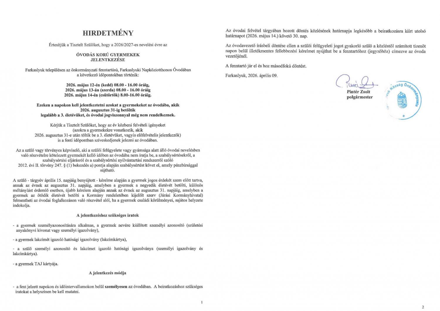 Szoros kapcsolatban a lakossággal együttműködve segítséget kíván nyújtani lakosainknak mindennapi ügyeik intézésében, aktuális információkkal az Önkormányzat munkájáró. Bővebben...